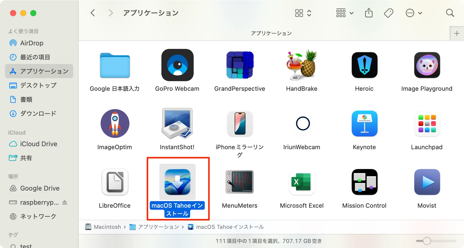 - ターミナルを起動して以下のコマンドを実行する(アプリケーションフォルダにインストーラがあることが前提)。ボリューム名は2.のものに置き換えます。