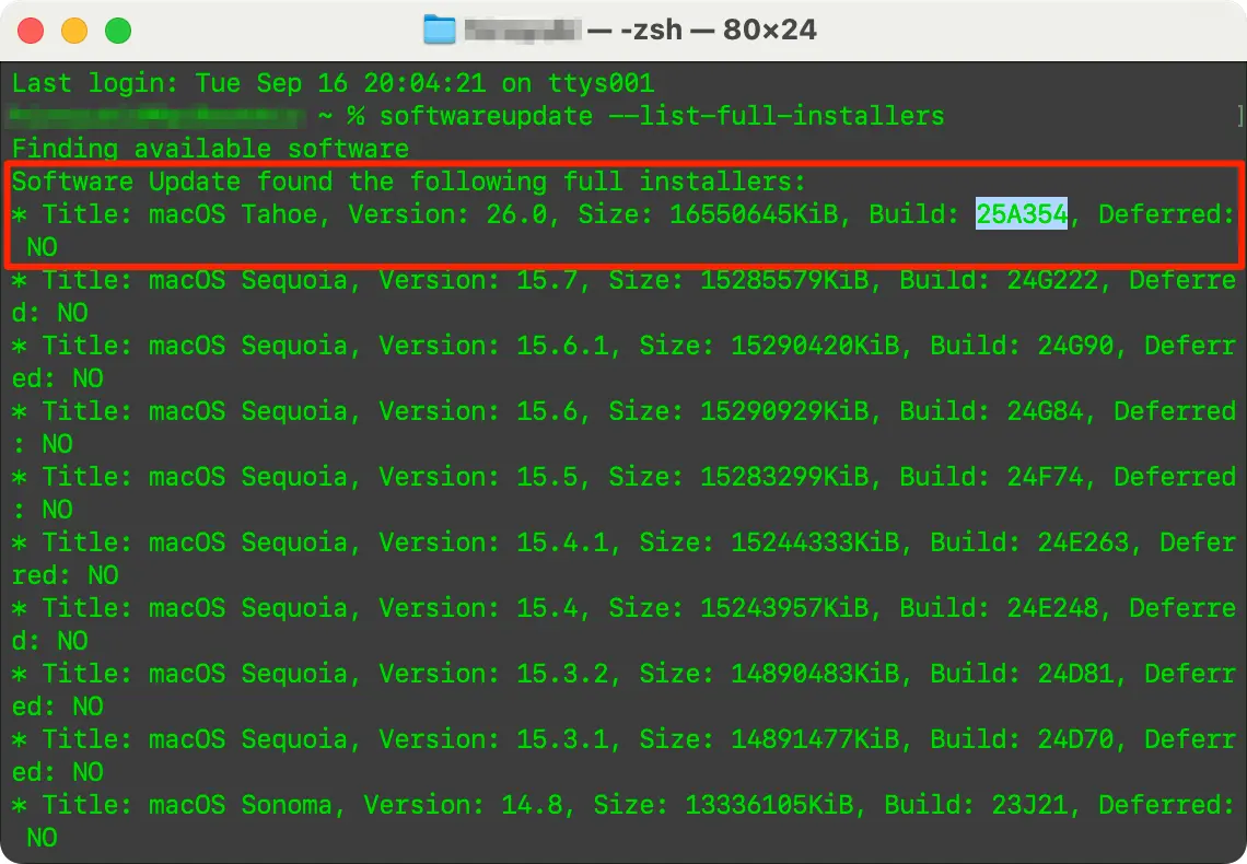 ただし、まだ正式公開前に実行してしまうとバージョンは同じでもビルド番号が古いβ版などがダウンロードされてしまうので、ビルド番号をよく確かめてからダウンロードしましょう。Tahoeならば25A354が正式版の最初の版になります。仮想マシンなどで利用します。