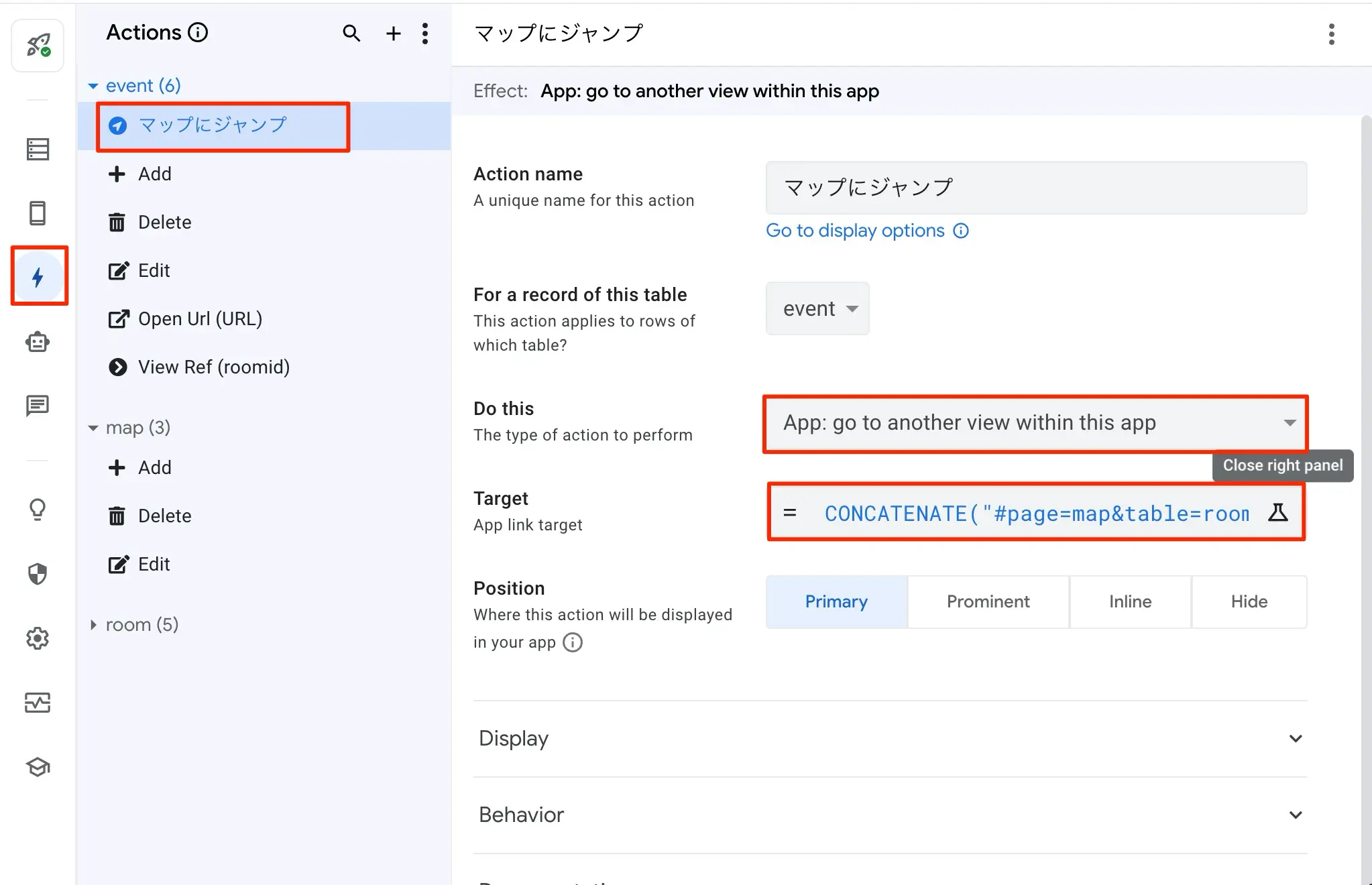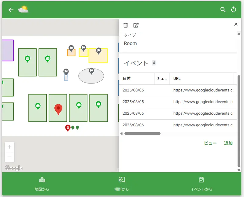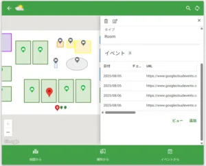 イベントから場所へのジャンプですが、リレーションを貼っていても親側のXY列を持ってこれないので、ボタンクリックでroomidを元にジャンプするようにアクションボタンに対して、URLを貼って飛ばすという技法を使っています。それ以外は前述の仕組みとほぼ同じです。