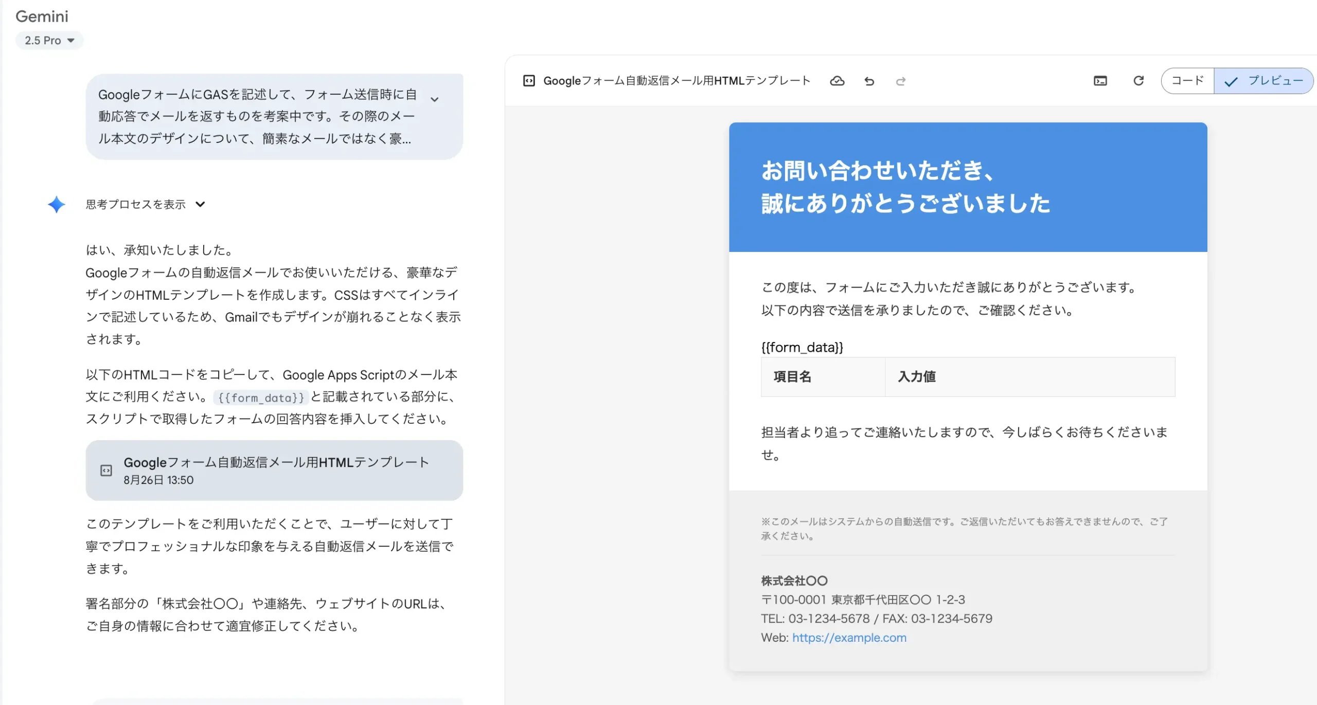 誠にありがとうございました部分がセンタリングされていたのでここを微調整してもらい、とりあえずの完成。このHTMLコードをGASのメール送信時の土台として利用します。