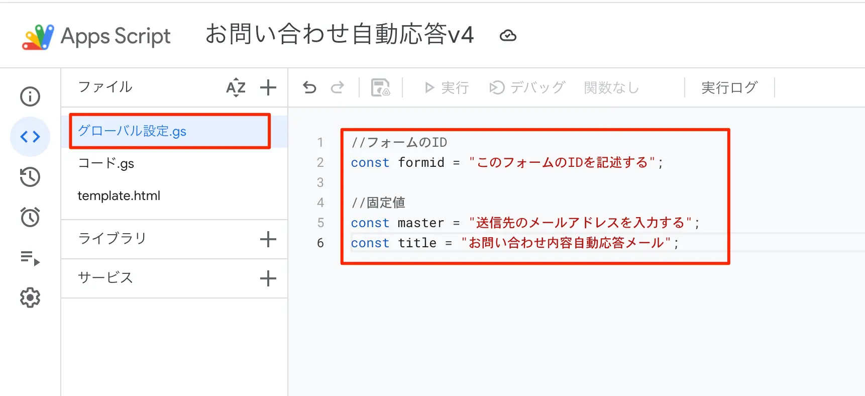 Googleフォームのスクリプトエディタを開いて以下の値を入力しておきます。