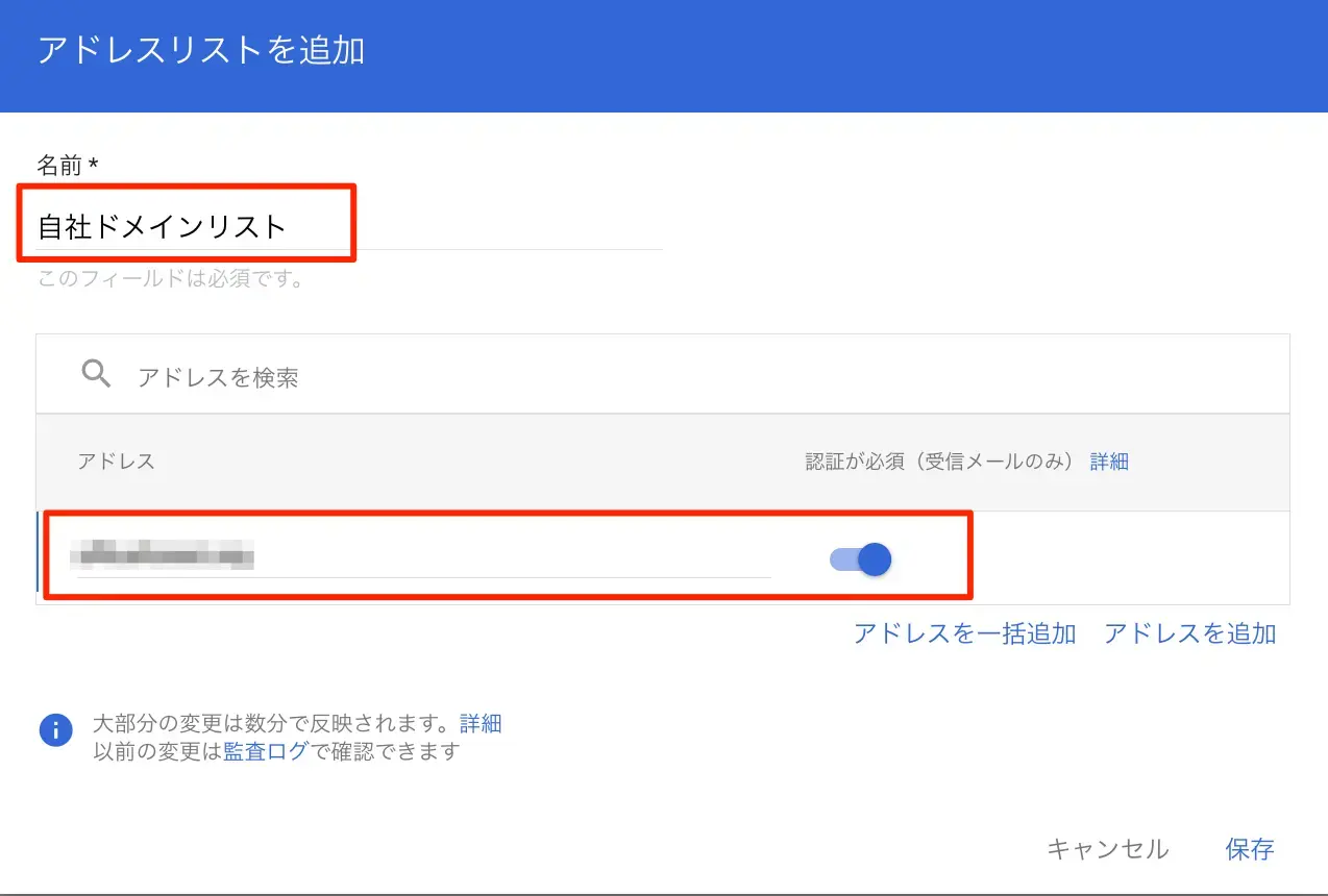 - アドレスリストに於いて、自社ドメインリストとして構築して、自社のドメインをいれる