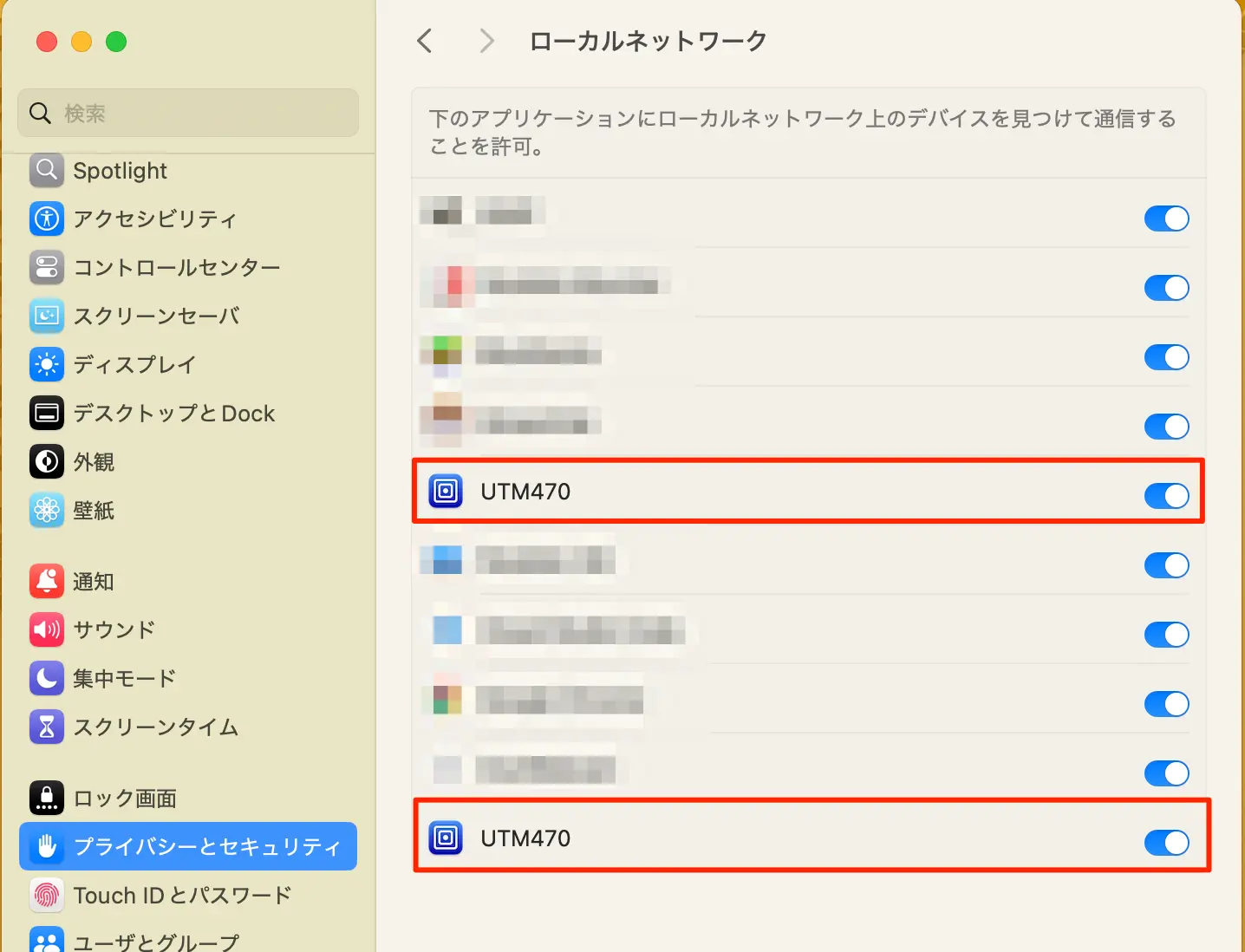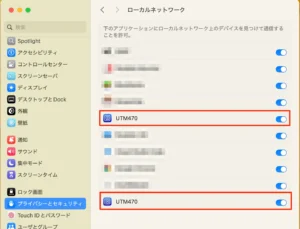 つまり、バージョンと名前違いでアプリケーションフォルダに2つのUTMが存在しています(理由があってこのような事をやってました)。結果、ローカルネットワークには後から追加したUTM470というリネームしたものが2つ存在してる状態になってしまい、トグルスイッチも連動してる状態。