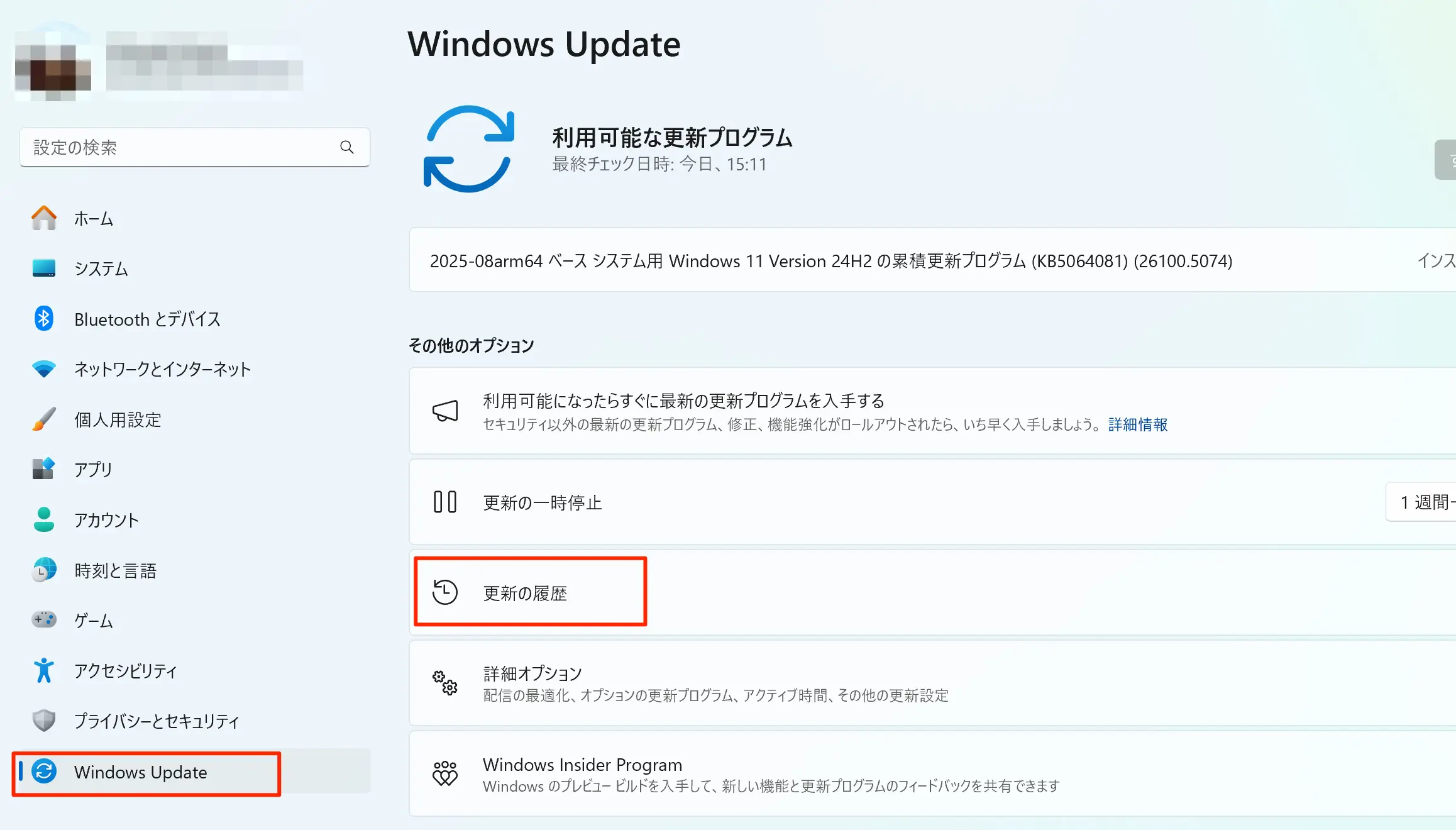 - Windows Updateをクリックし、一番下の方にある更新の履歴をクリックする