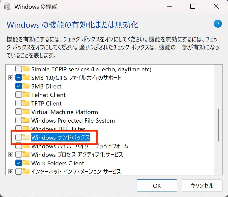 - Windowsサンドボックスという項目があるのでチェックを外してOKをクリックする