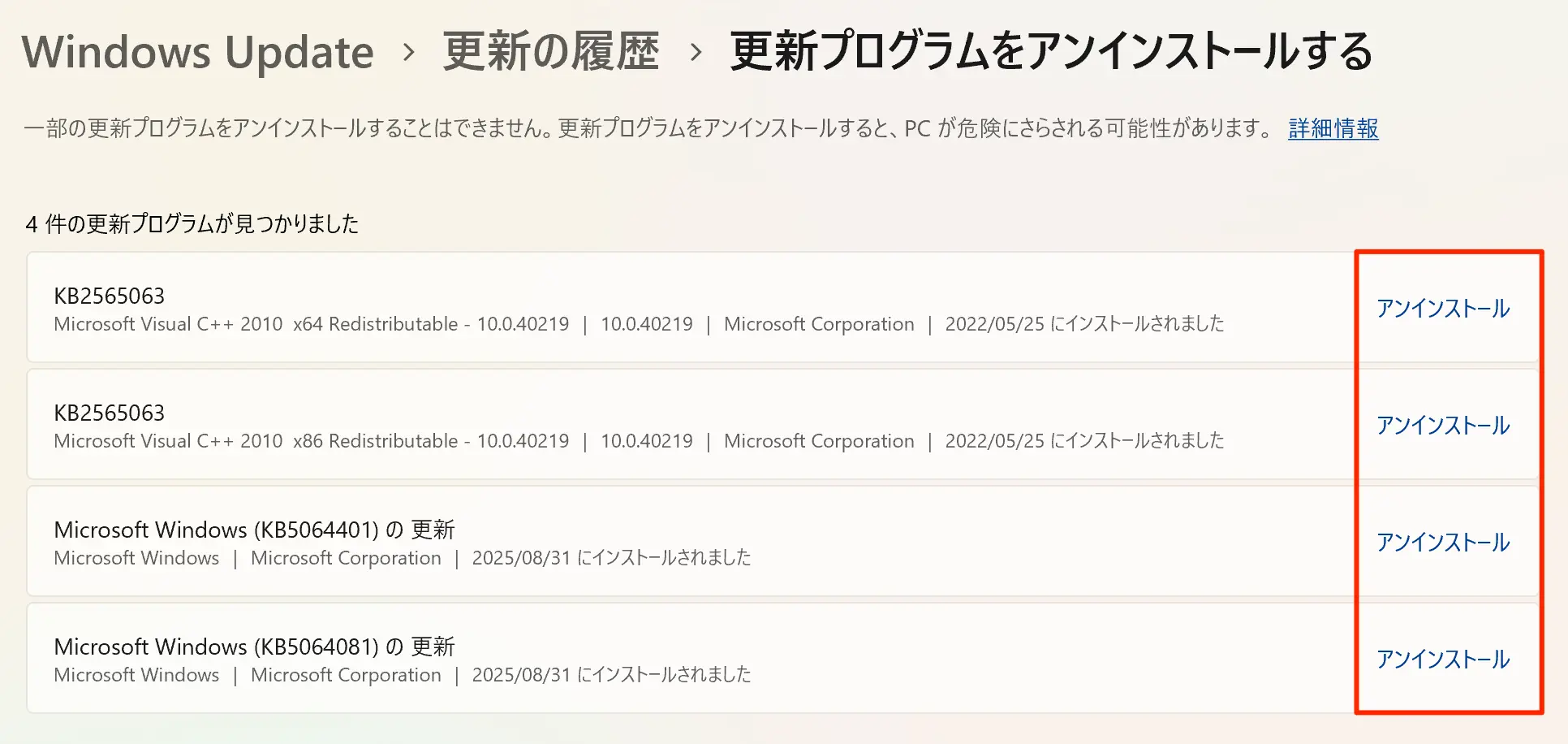 特に問題となってる今回のパッチはKB5063878ということですが、いくつかの手段を使ってアンインストールすることが可能ですが、事前に調査がまず必要です。