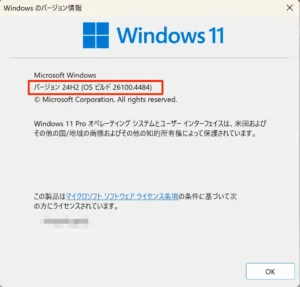 ダイアログが出たらバージョンとOSビルドの後ろに26100.4484といったビルド番号が出ますので、これを控えておきます。