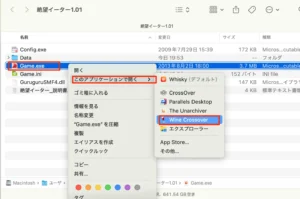 また、macOS用のWineでは、パッケージ化する事によって、macOS上の単体のアプリケーションとしてappファイルを作成する事も可能になっています。よって、Wineがインストールされていない環境であっても、そのまま実行することが出来るわけです。ちょっとファイルサイズ大きくなりますが。