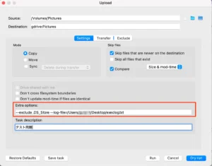 実行ログをテキストに残しておきたい場合には、rclone Browserのタスク作成時に出てくる画面にて、Extra Optionsに以下のような引数を追加すれば、rclone本体に渡されて指定の場所にログが残ります。