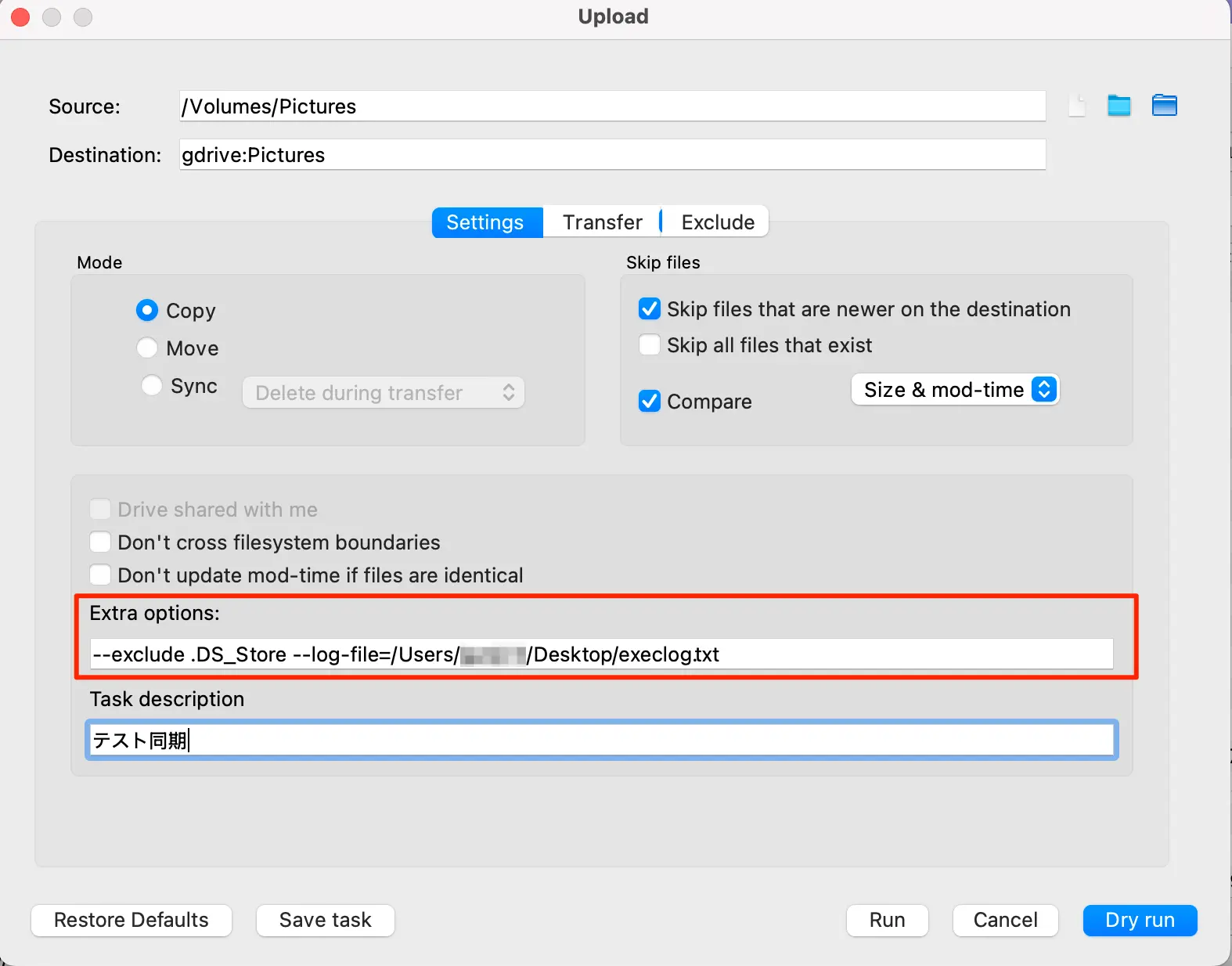 - Destinationは指定した共有ドライブのフォルダのパスがすでに入ってる。今回はgoogleという名前を付けてるので、google:tomato/と指定すると共有ドライブ直下のtomatoというフォルダ内に7.の中身が同期されるようになります。