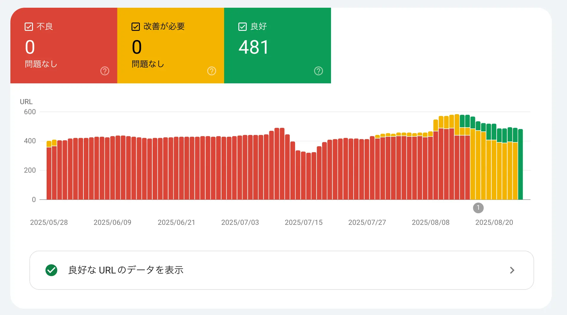 - 重要視するのはSearch Consoleの値。結果が良くなって再検証実行しても反映するまで相当時間が掛かるので辛抱強く待つこと。