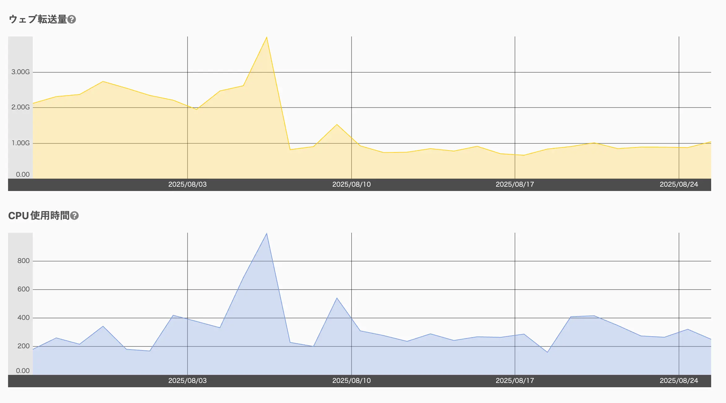 サーバ転送量で先週比で1.48GB減(27%改善)、CPU使用率では先週比で84分減(34%改善)しました。サーバ契約転送量は上限が決まっているので、上位の契約プランに変更せずにだいぶ余裕を確保することが可能になりました。